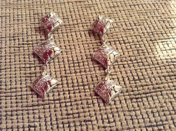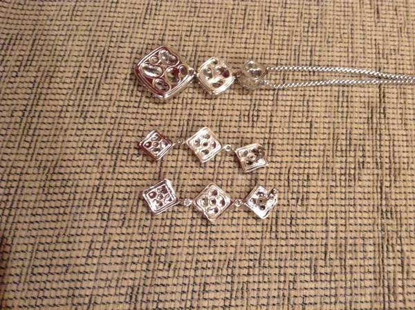 Set of silver plated dangle earrings and pendant is dressy and eye catching. There is a sparkly element in every piece which pictures do not really show. The earrings are 2.25" long and pendant 2.5" long with 16" long chain. Please take a good look at the pictures as they are a part of the description.