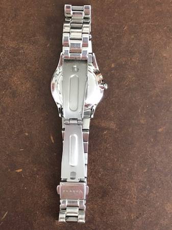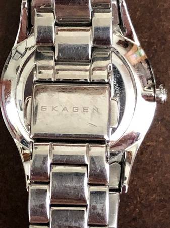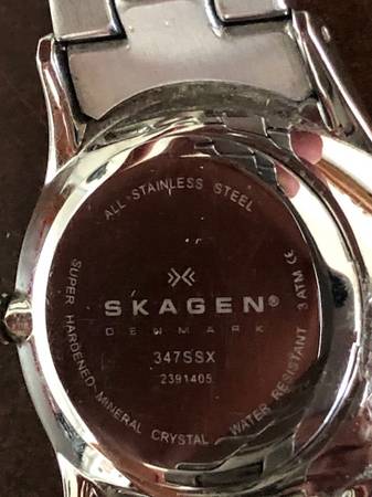 Ladies Skagen Watch -- Preowned Works however bezel has a crack so use is mainly for parts Model 347SSX Analog Quartz Crystal Bezel Stainless Steel Water Resistant Push Button Clasp