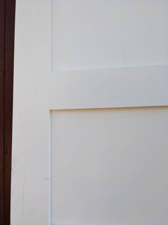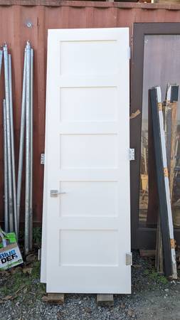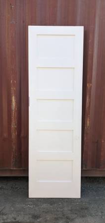 $150 each. Very high quality custom made in great condition. White lacquer finish, each has 5 recessed panels, indoor, used but in great condition. Hinges for the doors are $20 each hinge, most of the doors take three hinges. The original, high-quality door knobs that came with these doors are $40 each. We priced the hardware separately since some customers want to use their own hardware.