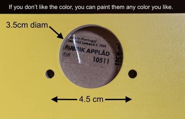 The recessed holes for hinges are 3.5 cm in diameter with mounting holes on 4.5 cm centers as shown in the third photo.
