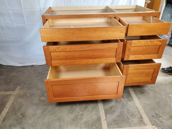 11 piece solid cherry hard wood face, maple ply frames custom made by Precision Cabinets and Trim. High end cabinets that were removed for remodel. Made with solid construction, high-quality materials, and durable hardware. They also have smooth, non-porous surfaces that are easy to clean. In good condition. Self, soft close. Very beautiful set. More photos upon request.