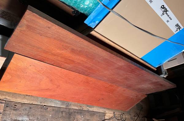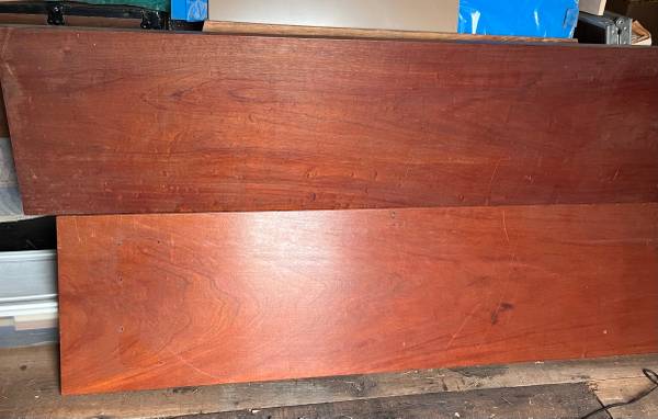 2 cabinet doors New 8” x 27 3/4” $25.00 Honduras Mahogany solid boards 1 1/4” x 16 1/4 x 6’ $150. Each Oak Stair Tread, reclaimed 12” x 32” x 1” $20.
