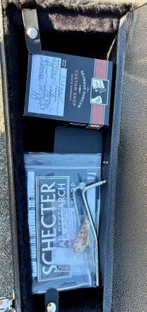 Floyd Rose ”Pro” trem. Bridge pickup swapped to a Seymour Duncan Custom shop Nagus (original Schecter pickup included). Includes new titanium string lock screws, stainless saddle screws, locking nut screws, Red Bishop Magik- arm push in trem bar.