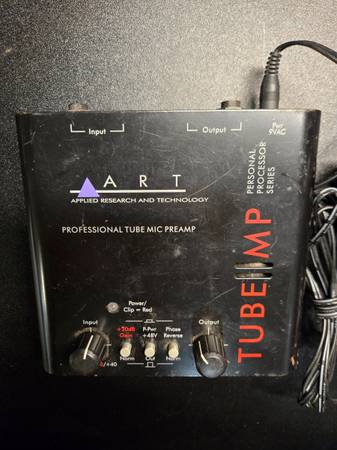 ART TubeMP Microphone Preamp: HUGE amount of gain in this unit (from +6 to +40db, with an additional +20db selectable boost for 26-60db operation). With an output fader as well, there is a TON of optionality for driving the tube circuit to saturation and distortion, but bringing the output level back down to a reasonable level so as not to overload / clip your converters. The unit also has 48v phantom power and phase reverse switches, as well as XLR and TRS inputs and outputs. Desktop operation, comes with original power supply.