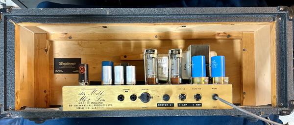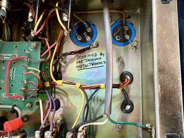 The amp has Lee Jackson's added 12ax7 gain stage, Mid Frequency selector switch, added master volume and push-pull Volume and attenuator on the back of the amp. The pictures clearly show the condition of the amp. The mods are unmolested, components look clean/good and the amp is nice and healthy. Here's an opportunity to score an original vintage clean Lee Jackson "Metaltronics" modified Marshall.