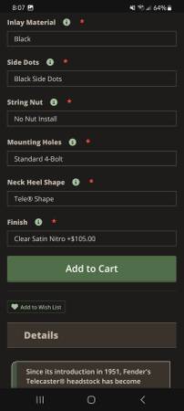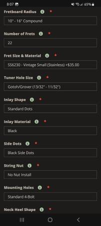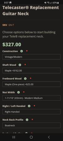 I'm attaching screenshots of the Warmoth Tele neck order form I filled out a few days ago with all of the specifications and options I recall using for the neck of this listing. (These screenshots are NOT the original order form for this neck, but just for your reference of what to expect.)