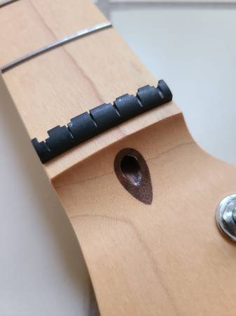 Earvana compensated nut, NOT glued in. I might have slightly messed up the sanding on the bottom of this nut, but I'll include it in the sale of this neck anyway.