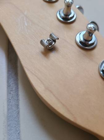 The only real imperfection of this neck is here. In order to install this string tree, I had to pre-drill a hole for it. That went fine. But then the screw I used broke off in the hole! Fortunately, it broke just below wood level, but unfortunately I couldn't get it out. So I just drilled a second hole a few millimeters away using the same drill bit and the same size screw and THAT worked just fine. So the string tree you see sits just next to the broken screw stuck in there, about half covered by a plastic spacer I have under the string tree. Still visible is the pencil mark where I drilled that first failed hole and the broken off screw. I tried to capture this in photos but it's really hard to see. While not ideal to have a broken screw stuck there forever, I'm confident it didn't affect the structural integrity of the currently installed string tree.
