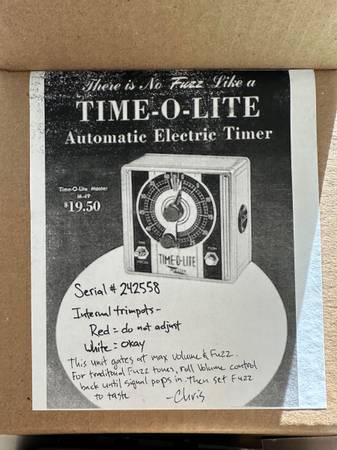 New, R2R Electric Time-O-Lite Industrial Timer Fuzz #58, AC107. 2025. I am the original owner and bought this brand new before it sold out within minutes after going on sale. Only used it carefully just once to verify it works. Well, it definitely works and sounds killer! It's been sitting in the original box ever since then. Also comes with two film negatives as part of the vintage-inspired packaging. All cosmetic imperfections such as wear, scuffs, scratches are all purposely factory-made.