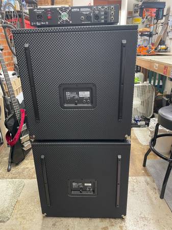 Super versatile Ampeg “Flip-Top” PF800 amp and PF210HE cabinet with added PF115HE cabinet, all in almost perfect new condition.