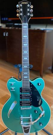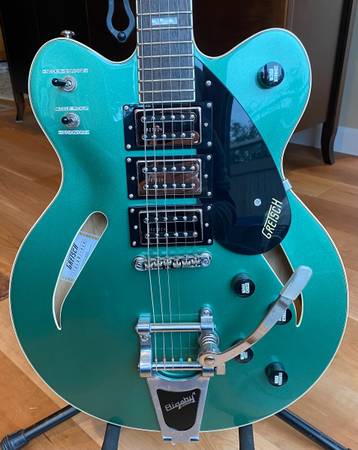 Gretsch G2627T Center Block 3-Pickup Cateye - beautiful Georgia Green finish, Bigsby vibrato, Hard shell case included. Unique pickup switching system allowing any combination of the 3 pickups to be...