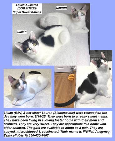 If interested, call/text Kris at . Note that they are only available to adopt as a pair. Rehoming fee applies - $125 per kitten.