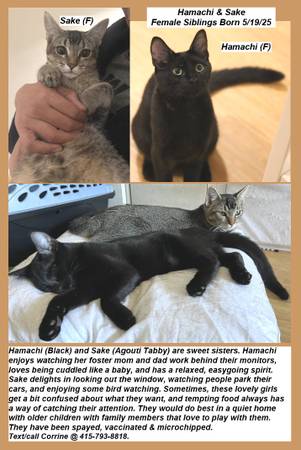 If interested, call/text Corrine at . Note that they are only available to adopt as a pair. Rehoming fee applies - $125 per kitten.