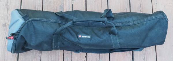 The Manfrotto MBAG90P bag holds the head and tripod system and includes a shoulder strap.