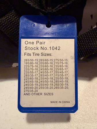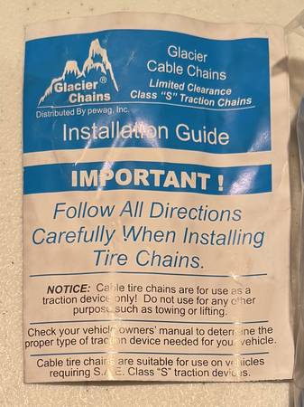 One pair of Glacier Chains snow chains. Stock #1042 I purchased them a few years ago for a 2020 Subaru Outback and never used them. Below is a list of compatible tires sizes that they will work with...