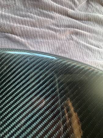 This is genuine carbon fiber, not fiberglass or wrapped plastic — you can see the weave clearly under the glossy finish. The clear coat is in great shape with only a few tiny mineral spots, which can easily be polished out.