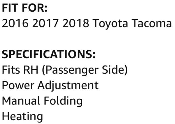 -Brand NEW High Quality After Market DRIVER And PASSENGER Sides Of Toyota TACOMA Mirrors , -Available in 3 Options To Purchase From: —MANUAL $35.Each —POWERED $45.Each. — TAKE a Sets Of 2 L+ R Sides...