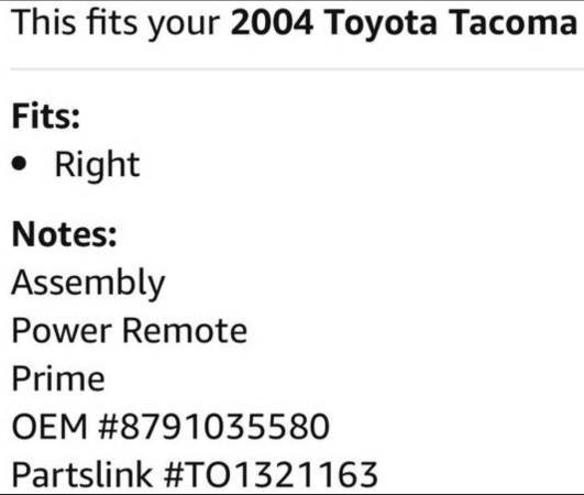 Brand NEW High Quality DRIVER / Passenger side Toyota Tacoma Mirrors. -SOLD As a Sets Of L/R Sides Together in 2 Options: —in MANUAL $70.Pair/Firm —in POWERED $79.Pair/Firm -Available for pick up at...