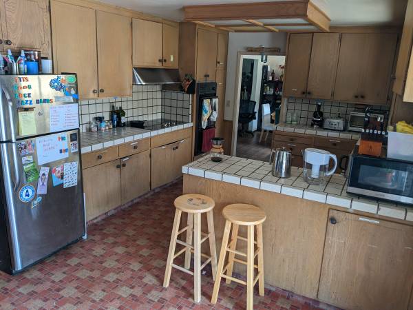 We have a communal grocery system facilitated by a Costco membership and two fridges, which makes it easy to cook together informally as well as for our weekly house dinners. Utilities + all food and other shared house costs usually come to ~$350/mo. We expect everyone to pitch in on cleaning up after group meals and keeping common spaces neat; each housemate is responsible for a weekly chore, and every few months we’ll do a deep clean as a group. We have a strong preference for residents who can commit to staying for at least six months (the longer the better!). There is parking available for all tenants. Unfortunately, our landlord has a strict no pets policy for dogs/cats/pigs, but an animal that doesn’t roam free might be ok. Although the available bedroom is probably best suited to a solo occupant, we are open to couples who might want to move in (monthly rent for couples is $645, each).