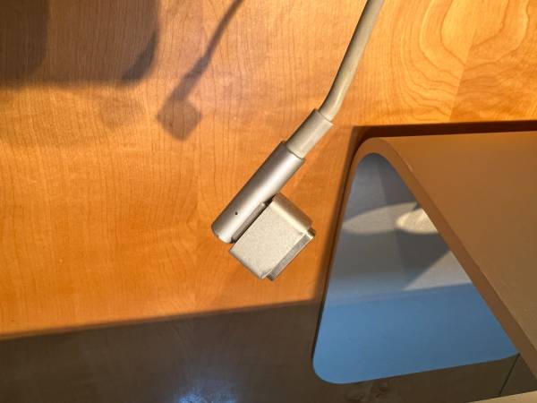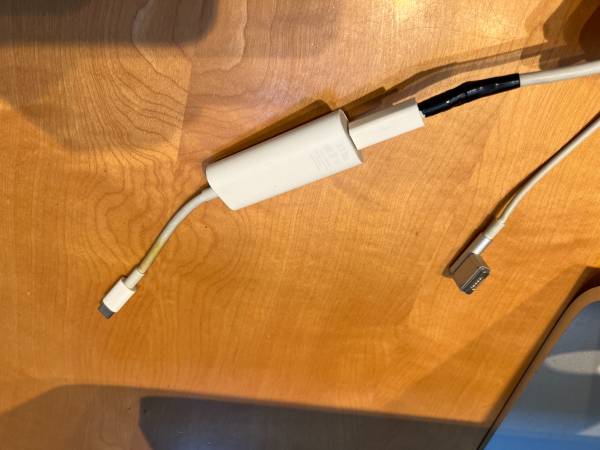 Includes magsafe adapter for laptop power and display port built in to the native wire harness. Also I will include the display port to USB-C adapter to connect to just about any display out.