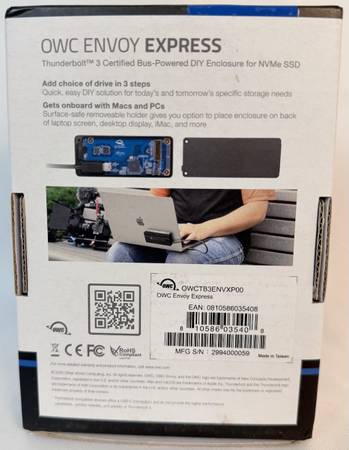 The OWC Envoy Express Thunderbolt 3 M.2 NVME SSD Enclosure connects to the Thunderbolt 3 (or later) port on a compatible Windows or Mac computer and transfers data at up to 1553 MB/s. No additional drivers or power adapters are required. Its durable construction is made from black anodized aluminum - the enclosure features a stylish and rugged design that quickly dissipates heat for optimal performance.