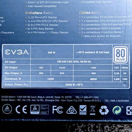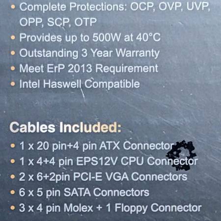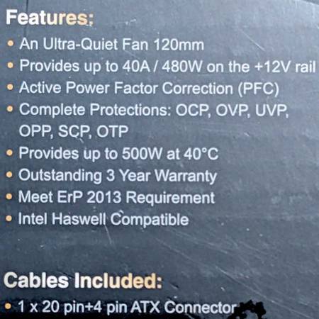 Features an ultra quiet fan 120mm; provides up to 40A / 480W on the +12V rail; active power factor correction (PFC); complete protections: OCP, OVP, UVP, OPP, SCP, OTP; provides up to 500W at 40°C