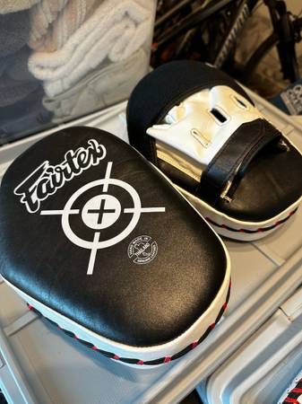 Lightly used Fairtex gear. BGV-1 12 oz gloves, KPLC2 curved kick pads, FMV11 Aero focus mitts. Selling as a package.