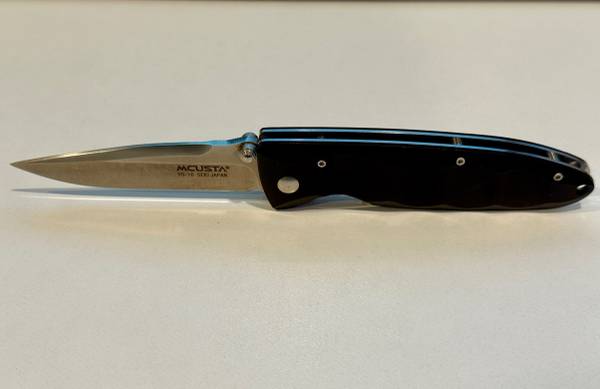 Excellent condition Mcusta Wave pocket knife, black Micarta scales and 3.25" VG-10 blade. Full specs here: https://mcustausa.com/mc-10v-classic-wave-vg-10-blade-blue-micarta-4-37-folding-knife/