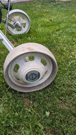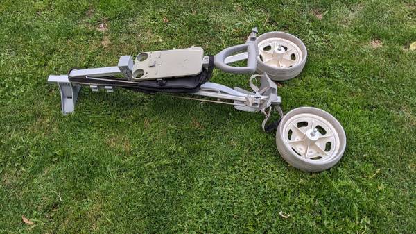 Lightweight Aluminum Push/pull Folding Golf Cart. Good condition, works fine. Upper strap for holding bag was replaced. Wheels remove for storage. Includes zippered pouch for accessories. Near...