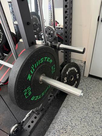 • Bumper plates on hand in common sizes (10/25/45 lb shown) for barbell or plate-loaded moves; speckled rubber construction is floor-friendly and quiet on contact.