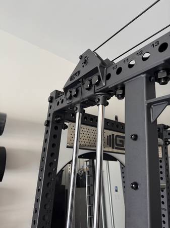 • Heavy-duty all-in-one home gym based around a 3×3 steel power rack with numbered 1” holes for precise height indexing and easy repeatable setups.