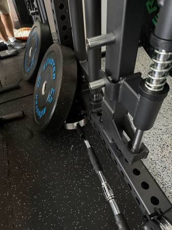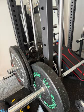 • Adjustable bench present in the setup for flat/incline/decline work; pairs naturally with both the free bar positions and the Smith carriage.
