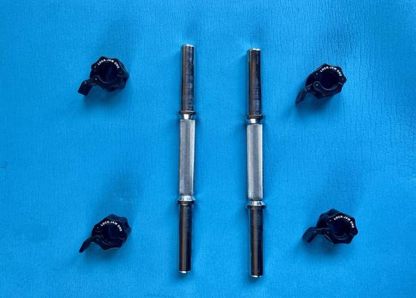 Two 1-inch chrome dumbbell bars - non-threaded. 3.5 pounds each. Four 1-inch Lock-Jaw clamping collars. Fits most standard 1-inch weight bars. Single-action cam lock securely clamps on bar. Solid...