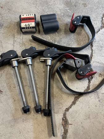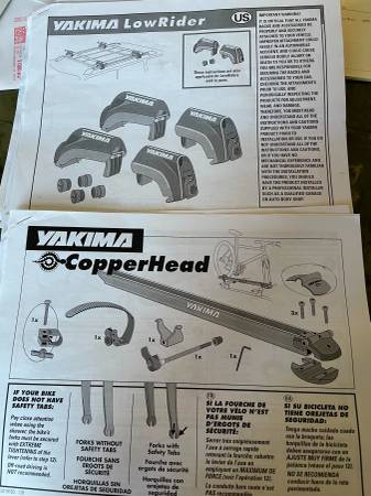 Set includes roof rack, 3 copperhead fork mounted bike rails, straps for securing back tires, and instruction sheets.