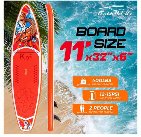 This is an amazing FEATH-R-LITE inflatable stand paddle board that is 11'6''x33''x6'', ultra-light, and easy to carry around. The board is designed with high-quality materials, and it is perfect for water sports enthusiasts who love to explore the waters. This board is ideal for both beginners and experts, and it is perfect for all types of water activities.