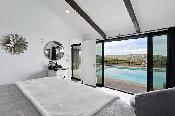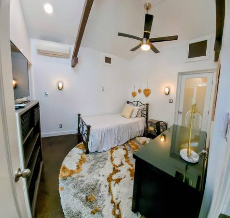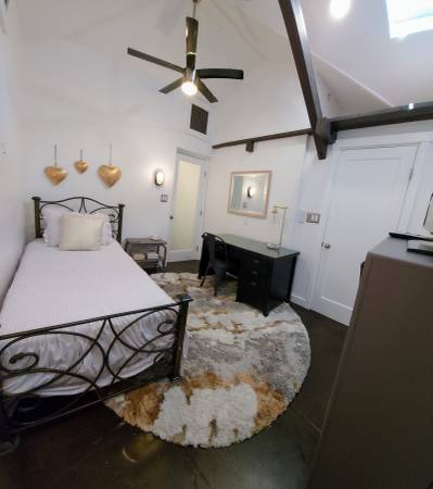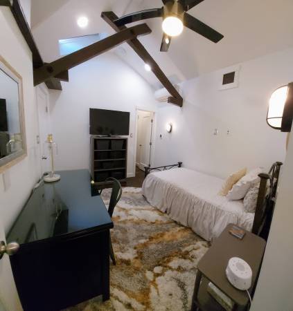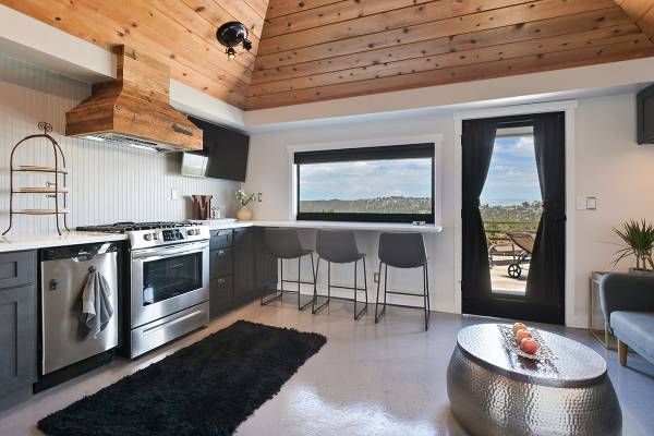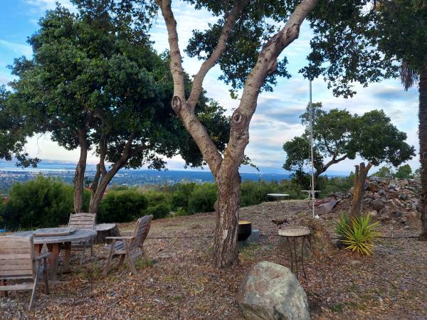 Fully furnished separate guest house with a truly unbelievable view from every room. The sunsets on the western hills are a nightly spectacle, and the water and city light views sparkle all day and night. This is a country setting, deer are present on the property. Rustic organic ranch inspired property with a chic, polished interior. It’s small but spectacular. Living kitchen, two bedrooms, one queen bed, one twin in the 2nd bedroom which serves as an office. In the hills above Redwood City, 5 Mins to 280, 10 mins to downtown Woodside, 10 mins to downtown Redwood City.