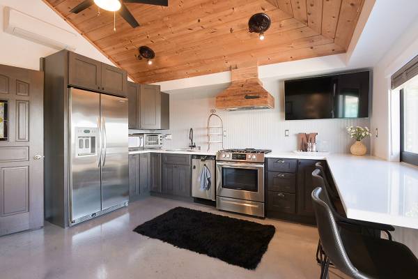 • Kitchen with onyx countertops, gas range, stainless steel fridge, range hood and dishwasher