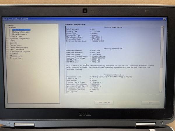 Dell Latitude E6320 Laptop, i7-2620M @ 2.7 GHz, 8 GB RAM, Dock, No HD