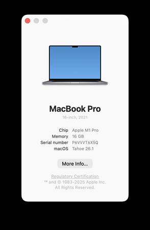 MacBook Pro 16-inch, 2021 Chip Apple M1 Pro Memory 16 GB Serial number P6VVVT6X5Q macOS Tahoe 26.1 Still under AppleCare, can be transferred to the new owner. Decorative lid sticker protected from...