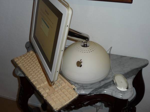 This working iMac G4, originally marketed as "the new iMac", is an all-in-one personal computer. The machine has an integrated, flatscreen, liquid-crystal display mounted on an adjustable stainless steel arm. The arm allows the display to tilt up and down across 35 degrees, swivel the monitor 180 degrees side to side, and raise or lower it by 7 inches (18 cm). A clear plastic "halo" frames the display. The 10.6-inch (27 cm) diameter hemispherical base that contains the computer components is heavy enough to support the display, with the neck strong enough to support the weight of the entire computer for carrying.