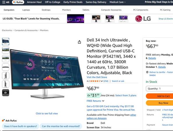 Dell 34" Widescreen Curved Monitor - $200 (san mateo)