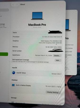 Selling My MacBook Pro 2019 with AppleCare +. Works great, used it for school. Check specks on the photo. Purchased from Apple Hillsdale in 2019 Thank you,