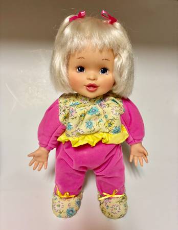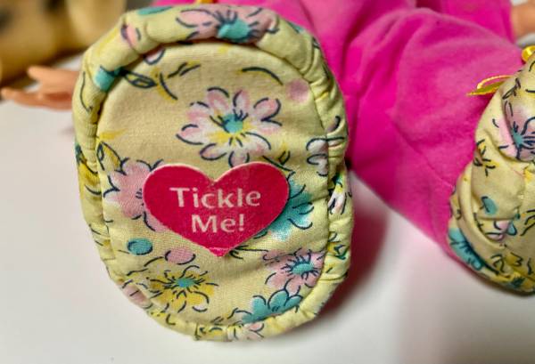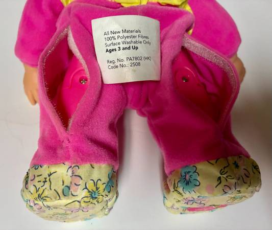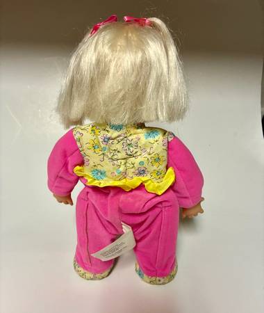 This is a rare tickle me interactive baby doll by General Creations 2001 that says things when tickled. Made of polyester with a washable surface. It stands 12 inches tall and takes 4 AA batteries (not included). Thanks for viewing.