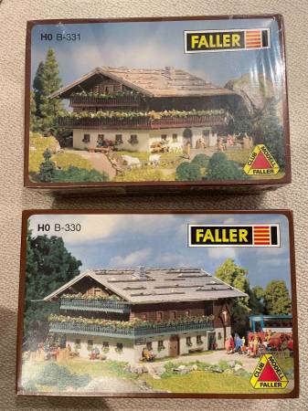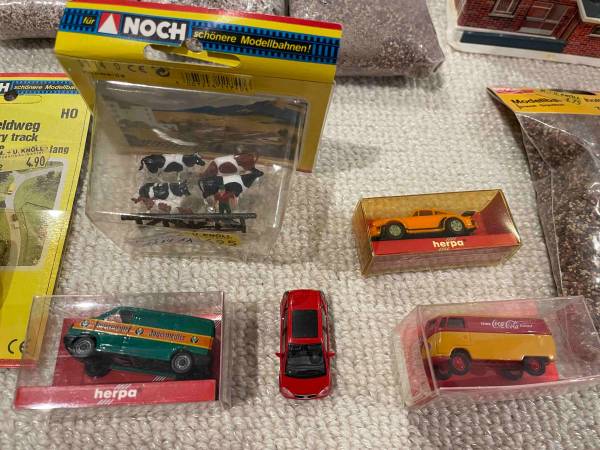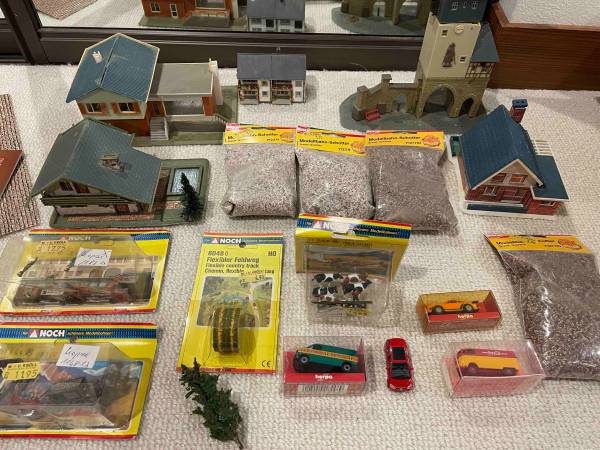 We have over 15 collectible HO scale model train rail kits mainly by Faller as well as kibri, eight of which are built. These are large structures including a church, ski lift, and more. See photos for details. Beyond the model structures, we have HO scale cars, animals, and other decorative accessories. Most of them are brand new and most still plastic wrapped. They start at $25/ea and range up from there depending on model. Inquire about price of each if you are interested.