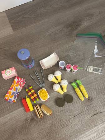 Cute Campus Snack Cart for American Girl Dolls! Includes most original parts, with a few missing accessories. Sturdy and great for play or display. Set includes: - towel - 4 ice cream cones - 2...