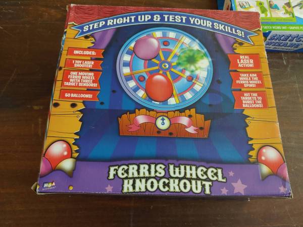 Pickup in San Carlos. Used - needs replacement balloons. This game is a sort of shooting gallery for at home in a ferris wheel theme. Your target is to shoot sensors with a sort of laser-gun. When you hit the sensor with the laser a balloon pops. This game can be played alone as well as with several players (using time targets for example). See video of actual item for sale here: https://youtu.be/PVy8aprUNMk (note that the one balloon that didn't pop was because the balloon wasn't placed properly in holder).