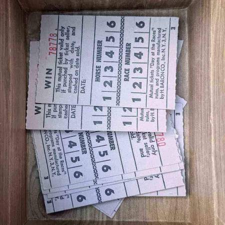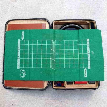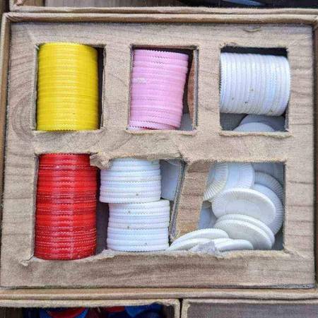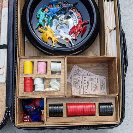 I am selling a pre-owned classic home gambling kit in a traveling case with roulette wheel, plastic ball, felt mat, plastic chips and dice, horse racing with plastic horse pieces, chess and checkers. Made by H Baron Company in the 1950s.