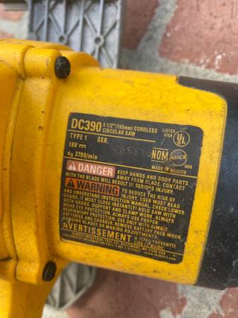 DEWALT 18v 6 1/2 INCH BLADE CORDLESS CIRCULAR SAW WITH BLADE MODEL DC398 MUST SEE IN GOOD WORKING CONDITION I ALSO HAVE OTHER DEWALT 18v TOOLS FOR SALE CONTACT TOM AT