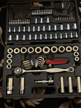 Power Torque 120 Piece 1/4, 3/8, 1/2 Inch Drive 6, 12 Point SAE, Metric Tool Set - Tool Set; 120 Piece; Durable storage cases with securely holds each tool in place for easy portability All tools are constructed of durable, heat treated Chrome Vanadium Steel for added strength Manufactured to ANSI spec for hardness and torque Contents: 1 Piece - 3 In 1 quick release ratchet handle 1 Piece - Bits Driver 3 Piece - Bits Holder 2 Piece - Hex Key Holder 3 Piece - Allen Wrenches are included. Asking $40 first come, first serve.