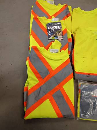 I am selling the safety it's 4 safety t..shirts largue used & new 3 cnts vests used large 1 universal sun shade new All its pyramex